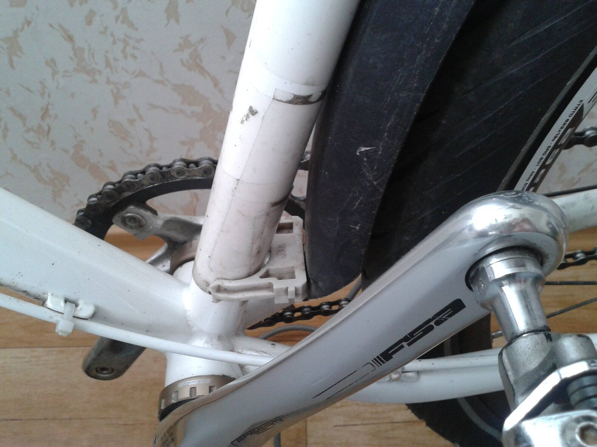В погоне за узким расстоянием между педалями была установлена шоссейная система "компакт". Но оказалось что звезда на 46 упирается в перья. Поэтому поставил звезду на 36. Она тоже достаточно близко к заднему перу расположена.