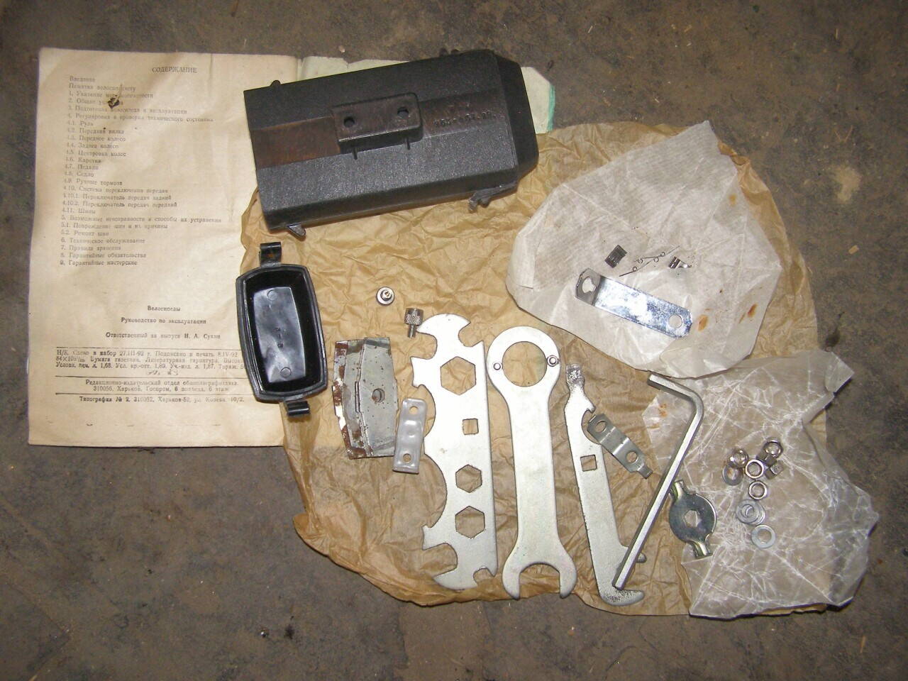 Внесу свою лепту. Ради истории выкладываю несколько фотографий модели ХВЗ "Спорт" 155-461 (согласно паспорту), чем она отличается от ХВЗ "Спорт" 155-441 - не знаю. По содержимому фотографий - данный экземпляр велосипеда ни разу не ездил, находится в разобранном состоянии, педали и руль в транспортном положении, трубки на колеса не клеялись, велосипед в заводской консервационной смазке, есть остатки бумажной обертки. Поэтому за пыль на велосипеде - извините, потенциально музейный экспонат не трогаю, руки не подымаются :smile: . В комплекте нет насоса, за полное содержимое ЗИП (запчастей и принадлежностей) тоже не уверен.