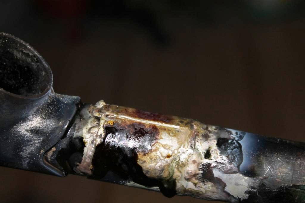 Чтобы припой плавился требуется прогревать металл до покраснения. Труба рамы тонкостенная и прогревается без проблем. А вот уже узел стыка трубы и рулевого стакана я прогреть не смог, там толстый металл и хороший теплоотвод.
