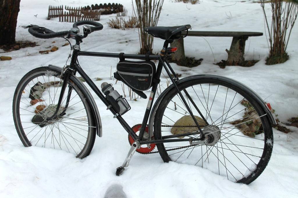 Ну серьёзно, сейчас вроде зима, метров 400 по асфальту я на нём проехал, чтоб тормоза опробовать, седло подогнать, а в огороде снег мокрый лежит, только в зимней обуви можно.