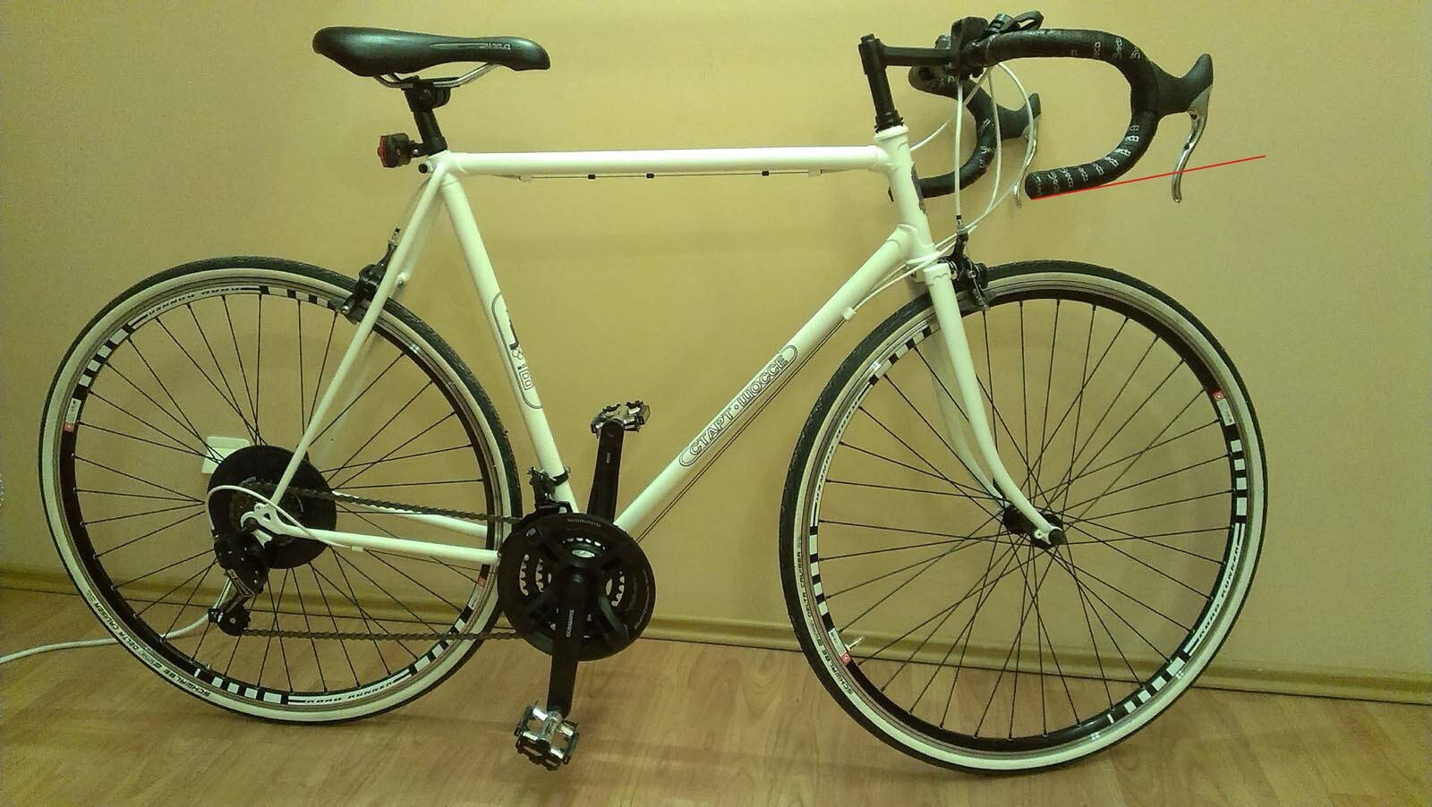 А вот тарелочку с задней втулки сними, ну как-то неспортивно смотрится. И очень желаю в будущем поменять эту оцтойную мтб систему на хорошую, хотя бы алюминиевую и хотя бы компакт 50/39. Обмотка руля хорошая, но можно было постараться обмотать так, чтоб не было видно беспорядочно разбросанных надписей Деда (форумчанин Степ в этом знает толк) - эстетика... иными словами велоспорт не был бы велоспортом, если в нем велы были б безобразны.