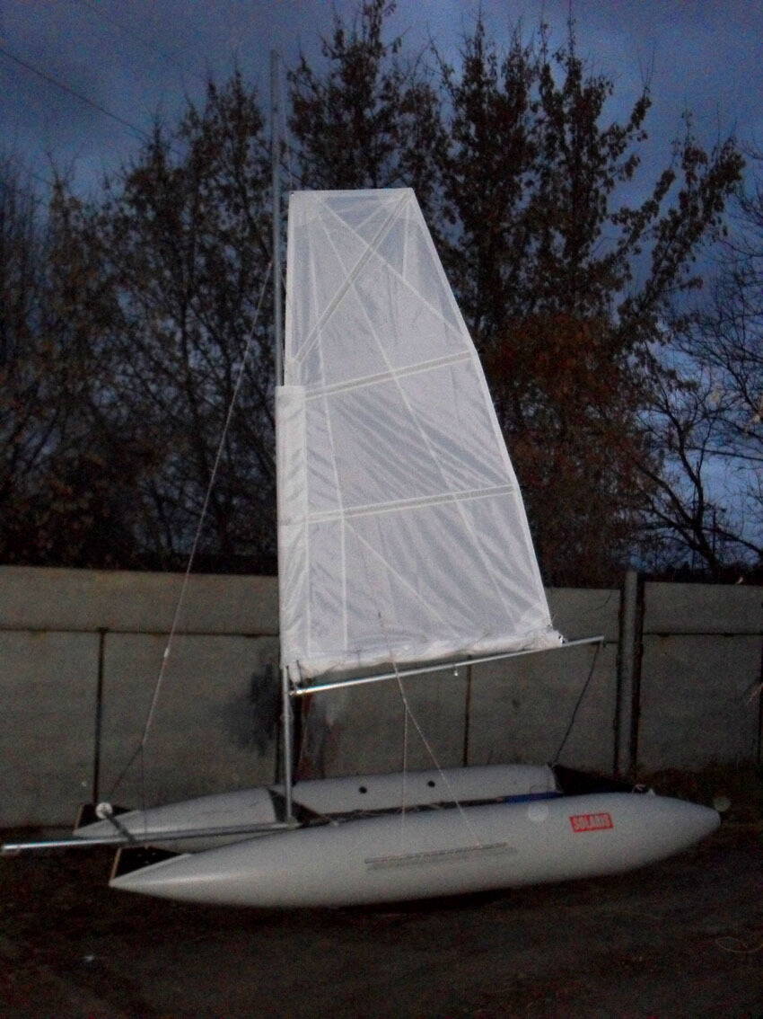 Теперь катамаран Альфа3 вооружается гротом нового образца.