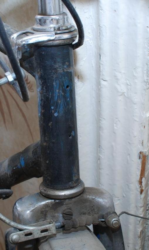 Рулевой стакан штампованый, а не труба с фиттингами для крепления остальной рамы. Причём нет даже декоративной подштамповки, изображающей те фиттинги, как делали на ХВЗ.. Не 90-е годы - дырки от заклёпок эмблемы есть, а они только на Минсках-Аистах к тому времени сохранились.