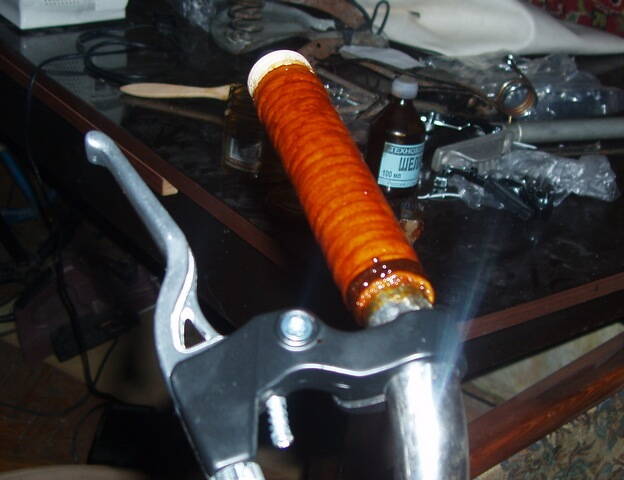 "Старинные" грипсы - это намотанная на руль брючная тесьма (я её еще на "момент" закрепил), пропитанная в 4-5 слоёв этим лаком. Очень приятны на ощупь, не скользят, хотя на вид почти глянцевые. Мало коцаются и легко подкрашиваются. При нанесении лака лучше (как всегда) наносить больше тонких слоёв, чем меньше толстых. Он-то застынет и будет прочным, но останутся некрасивые потёки. Сушка каждого слоя минимум где-то полчаса, окончательно сушить лучше ночь, или несколько часов на солнце. На фото: руль, заглушки-расширители, готовый лак, спирт, шеллак, брючная тесьма.