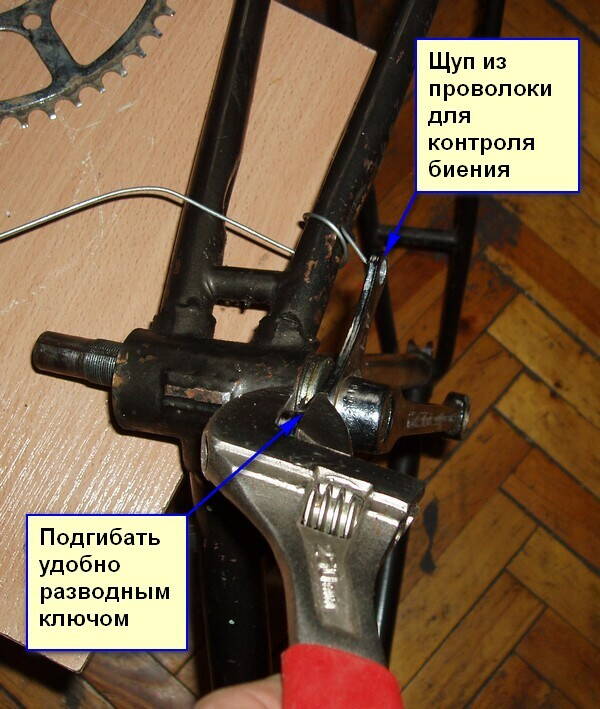 Если там всё в порядке, нужно рихтовать систему. Для этого собираем полностью всё вместе с клиньями, на раме из подручных материалов лепим щуп для контроля. Ровнять удобно разводным ключом, располагая его ручку по радиусу каретки - это важно, чтобы не скрутить что-нибудь "в пропеллер". Если система на трёхлапке - сначала ровняем её со снятой звездой. Потом прикручиваем звезду. Если звезды две, лучше прикручивать их по очереди и ровнять по одной.