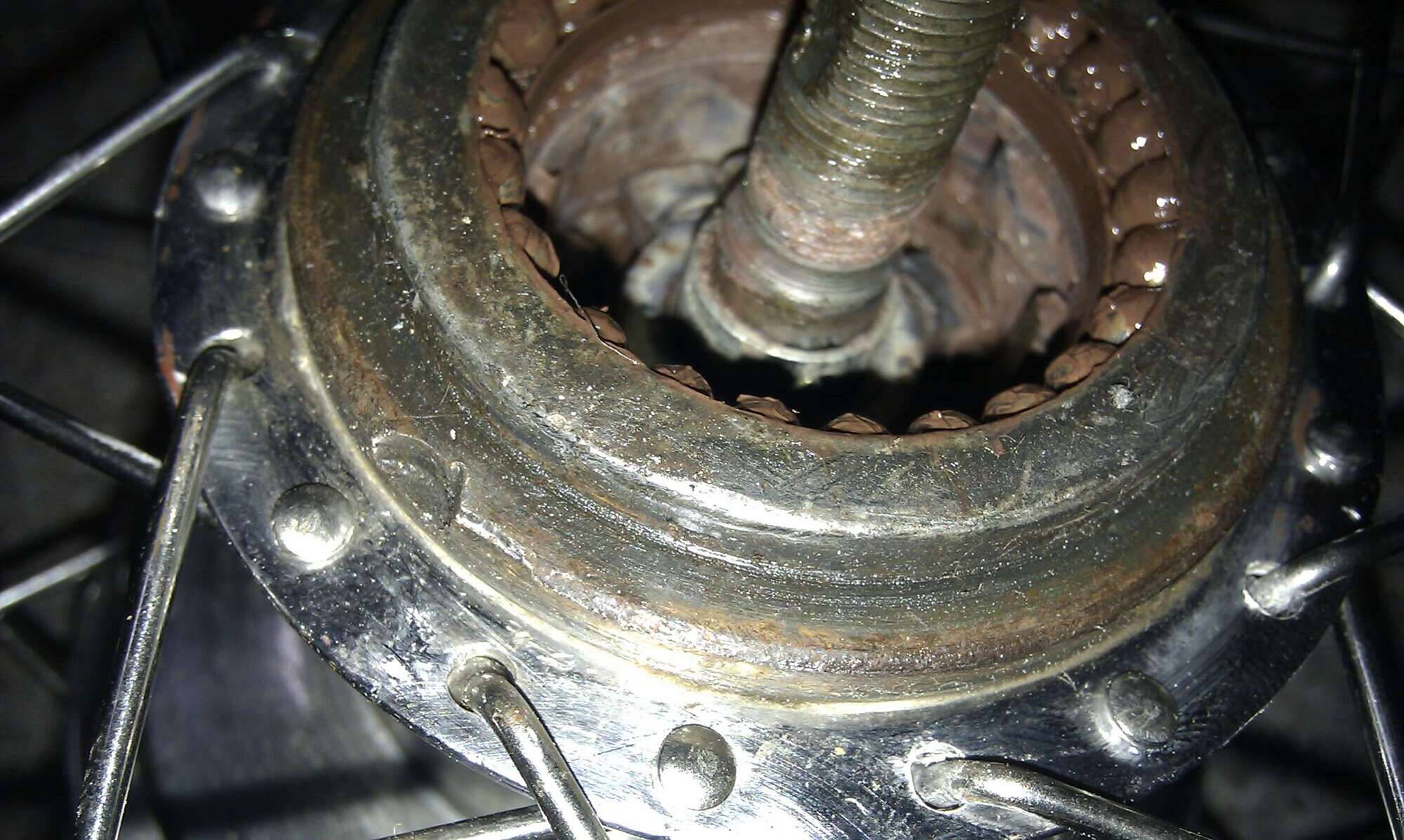 Собрал колёса. С передним всё норм, а вот из задней втулки, которая на первый взгляд была без криминала и которую я не смог разобрать, вытек излишек свежей смазки рыжего цвета. Снова снял сцепление и заглянул внутрь, а там всё рыжее. Однозначно надо разбирать, но снять обойму снова не получается, нужен дибильный ключ который нереально найти.Изображение