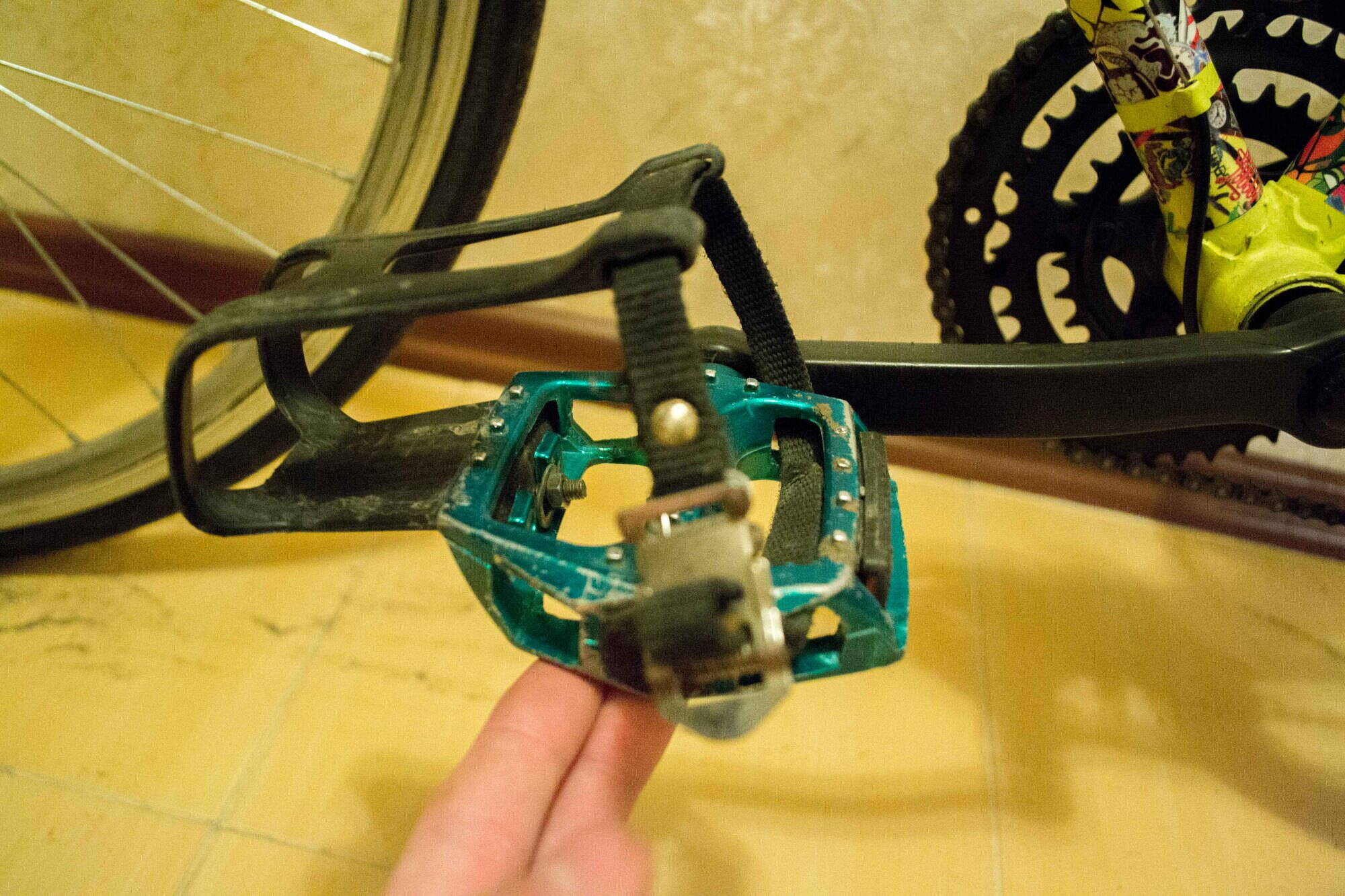 Летом было решено что я его доведу до ума. первым делом выбор цвета, родной красный цвет меня не устраивал, через два дня колебаний выбор пал на ярко желтый цвет, чтож сказано-сделано. Загрунтовав покрасил. Следующим шагом была замена педалей и установка туклипсов от старых. После были заменены/установлены передний и задние переклюки.
