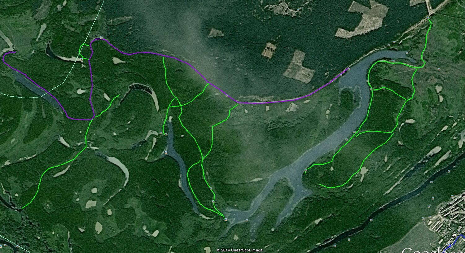 Вообще, в районе Зимовного есть масса лесных дорог - много старых, есть заброшенные, по которым даже на велике не проехать, но есть и новые, проложенные совсем недавно. Большинство ведут в тупик, т.е. к берегу какой-нибудь затоки, озера, или на покос в каких-нибудь дремучих е..нях. Тем и хороши :) На другой картинке по памяти набросал те дороги и тропинки, по которым катался (там и снимал те самые фото), зелёным. Часть из них уже сдохли, скорее всего; некоторые непроходимы при высокой воде. Дороги обозначены примерно, так как езжу там без приборов (так интереснее, и от комаров ничто не отвлекает).