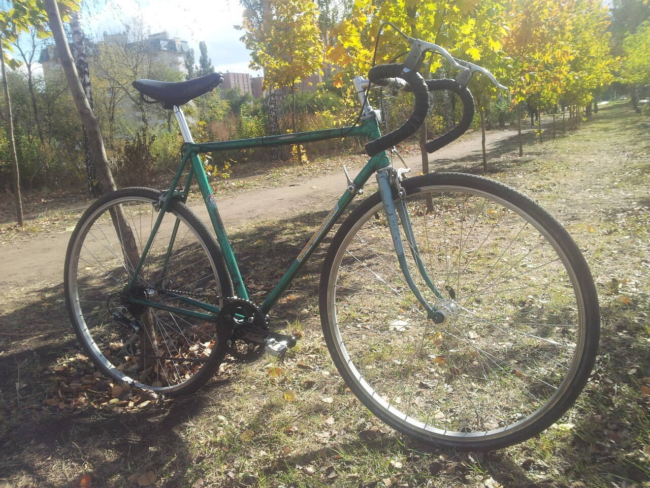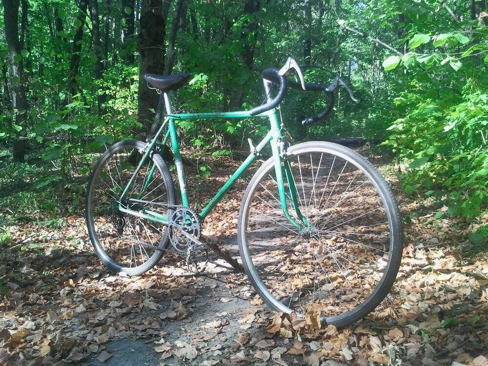 А вот второй проект, который смог осуществить совсем недавно. С прошлого года, после освобождение велобазы мне достались две рамы спутник в39, оба 1970года. Для себя решил оставить зеленую, так как вилка на нем родная, да и цвет радует глаз. В течение пару недель была собрана вся навеска, седло поставил ук начало 60хх, переклюк харьков, тоже начало 60хх, камеры и покрышки из старых запасов. На днях устроил тест драйв по лесам, гнать на нем нету никакого желания. Накат отличный, глотает замечательно кочки и ямки, вел очень понравился.
