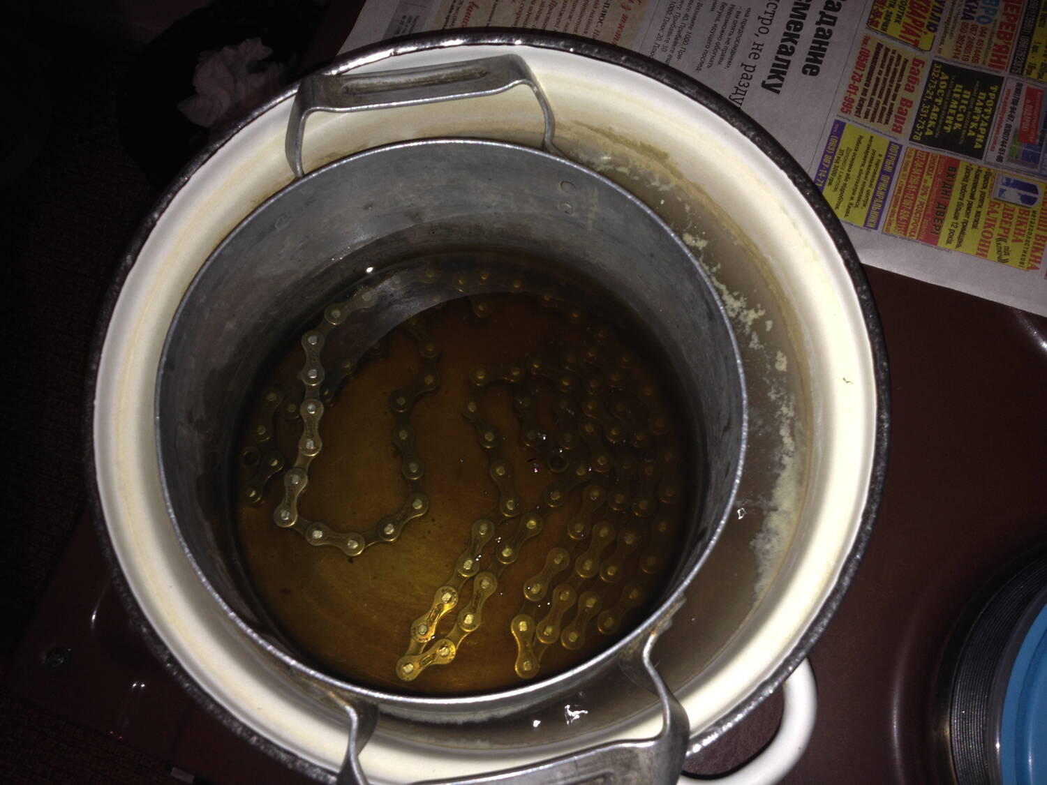 Удалось купить килограммовую пачку пищевого парафина в виде стружки и стограммовый кусочек пчелиного воска у деда на ВПБ (Великая Петровская Барахолка :D ). Смешал по пропорциям Кости - 5:1 (парафин\пчелиный воск). Цепь перед варкой вымывал Уайт-Спиритом, а потом моющим стредством "Gala для нежных рук" :lol: