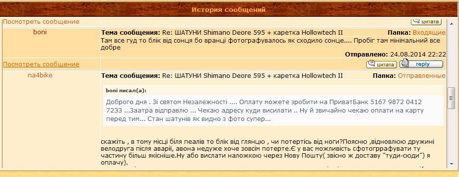 Купил шатуны . на фото потертостей видно не было , спросил о них и просил фото ,он ответил , что все гуд все как на фото , по краям то , мол, блики. короче отправил ( момент отправки сроком в неделю упущу - всякое может случиться) пришла коробка на вид целая помятостей и повреждений никаких нет .забираю (времени реально распаковывать на почте небыло) прихожу домой , распаковываю, получаю потертые и коцанные шатуны и раздавленную каретку. звоню говорю ,мол таки так почему каретка раздавлена,говорит почта виновата и вообще забрал - сам и разбирайся.все свои темы с продаж поудалял ,что бы не было улик как я понимаю