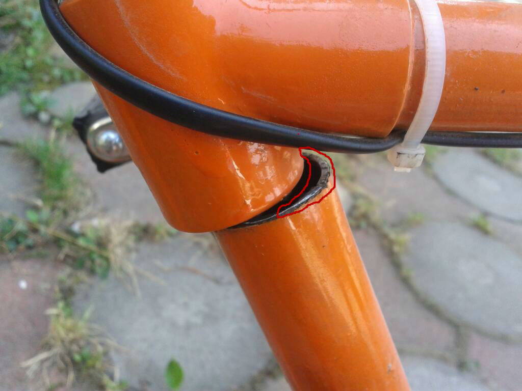 И опять беда, треснула рама, в самом неожиданном месте. Еду и слышу рип, стал, понажимал всем весом на педаль, а потом смотрю-труба выглядывает... открытый перелом рамы)