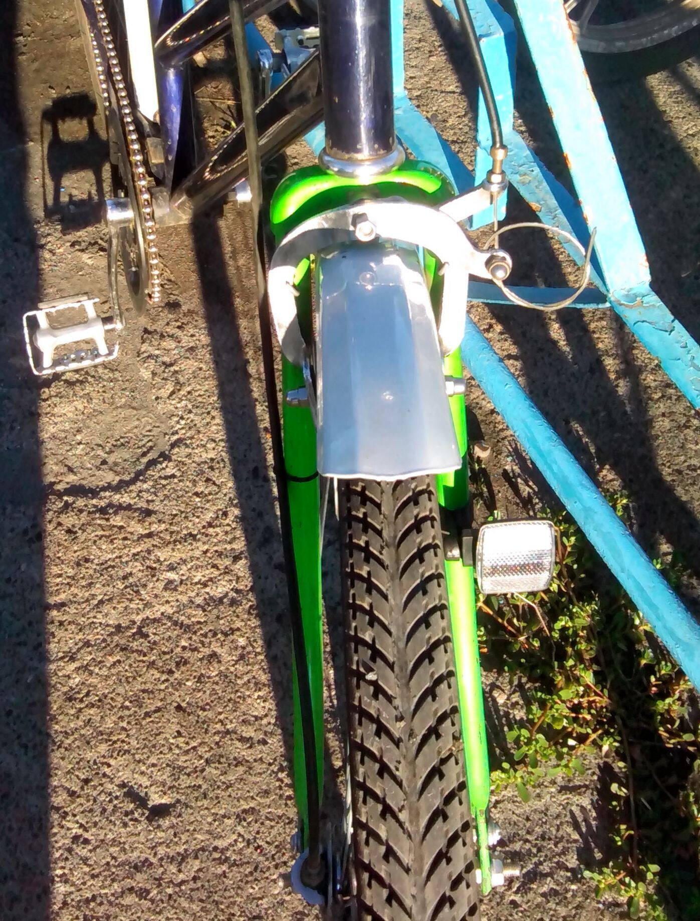 Перебрал старый, но почти неиспользованный советский передний тормоз, он был сильно кривой с магазина и в молодости у меня не возникало желания его рихтовать. Тогда поставил, поездил пару дней - тормозит плохо, трос дубовый, пружина как на двери подъезда, колодки под углом к колесу, трос из рукоятки выпадает, рукоятка на руле вращается... снял и бросил на балконе. А теперь пригодился.