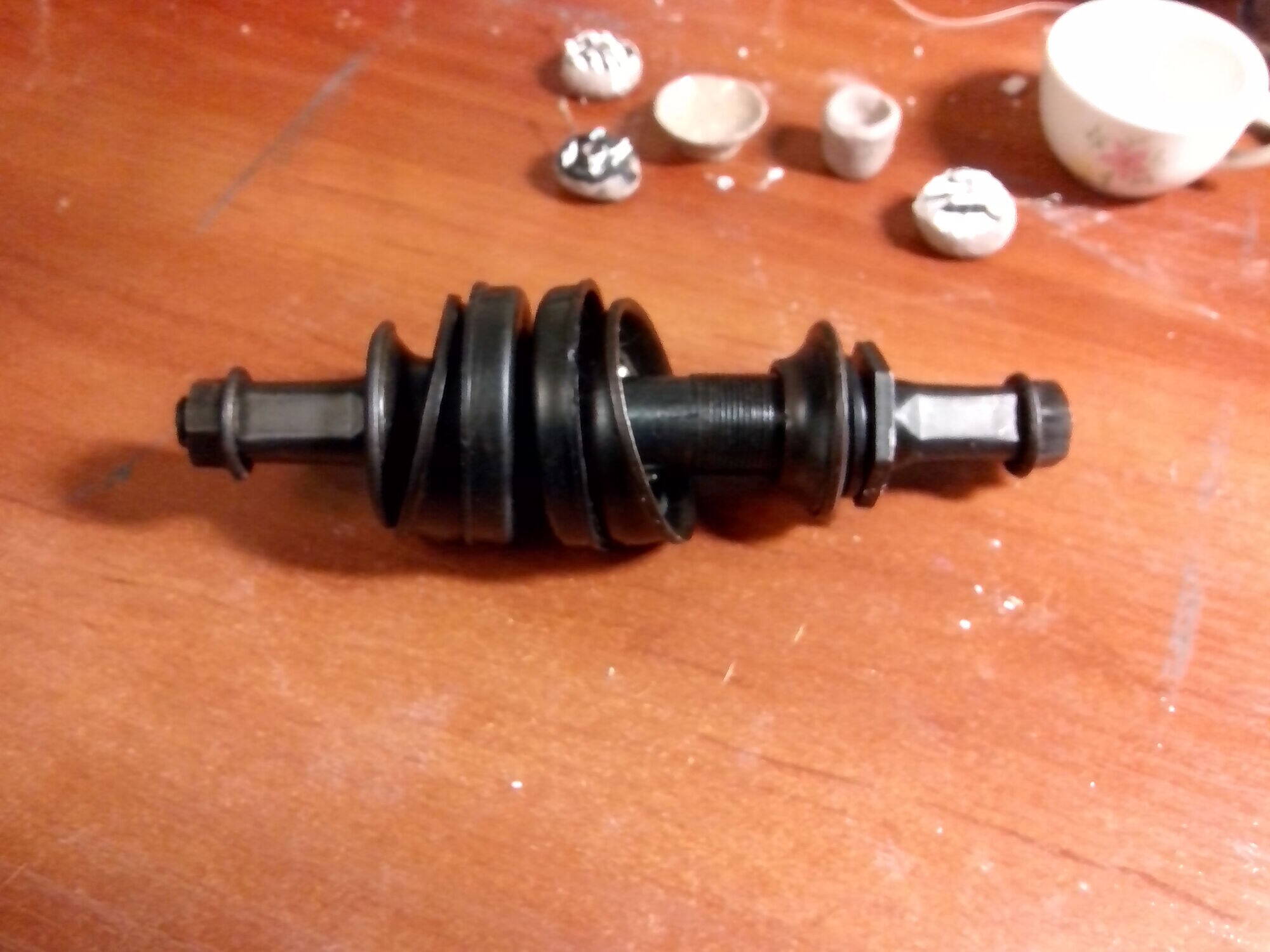 ... У той что у меня общая длина от конца до конца 146 мм, расстояние между наружными концами резьб по валу 81мм, минимальное расстояние между концом одной резьбы и началом другой по валу 43мм, наружный диаметр чашек по буртику 39мм, наружный диаметр чашек без буртика 35,4мм, наружный диаметр резьбы 18мм.