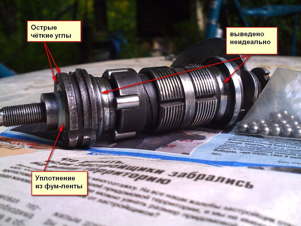 Потроха "Торпедо". Всё родное, на всех почти деталях маркировка "ХВЗ" (на малом конусе видна немного под моим уплотнением) Чуууть-чуть отличаются формой деталей от более новых. Ведущий конус-пятерик придётся таки менять, уже нашёл такой же, с острыми гранями. Дело в том, что питтинг на дорожках был сильный, из-за этого даже пришлось насыпать шарики без сепаратора. В левом подшипнике ситуация получше (правую именно дорожку как раз не видно), но я побоялся полностью убирать микрораковины, чтобы не превысить глубину термообработки. Подшипник там со старым сепаратором на новых шариках. впрочем, и в сто раз худшие "на ходу" пребывают десятки лет.