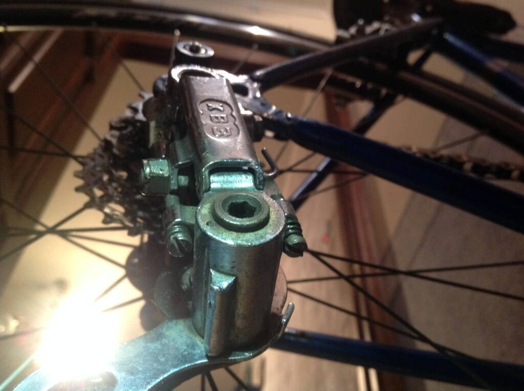 Дак и не выйдет этот переключатель под эти звезды корректно настроить - это ХВЗ переключатель, рассчитанный на работу с трещоткой на 4-5 звезд, а стоит восьмерик. Ему просто не хватает хода + установка более широких задней втулки и трещотки потребовало развода задних перьев - вот и нарушилась параллельность хода.