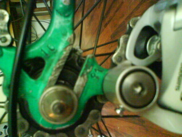 Зато с передним я провозился полдня. Читал на этом форуме, что передние клещи становятся без проблем. Мне же не хватило 5 миллиметров. Колодка покрывает обод только половиной площади. Вероятно потому, что вилка неродная.