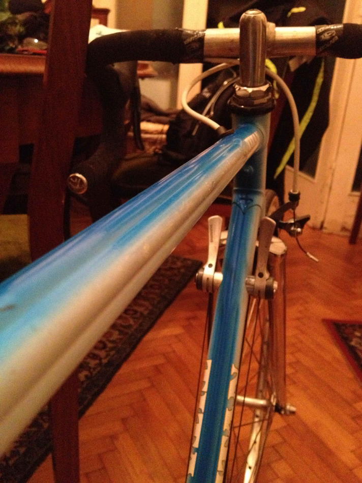 Из других деталей этих рам - дропы использовались Кампа 1010b с регулировочными винтами, каретки почти всегда были 73 мм с итальянской резьбой (у меня всё же 68мм BSA), подседел 27.0 или 26.8 мм, а не 27.2. Ещё интересно, что даже на самых дешевых рамах была внутренняя прокладка троса заднего тормоза и припаянные бонки манеток. На рамах подороже был и припаянный кронштейн переднего переклюка.