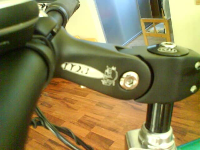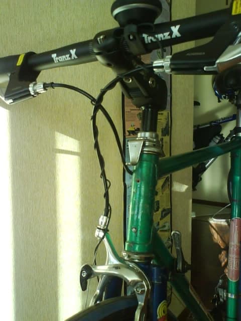 Штатный баран я заменил прямым рулем с регулируемым выносом, "дальнобойными" грипсами, тормозными ручками альхонга "вибрейк онли", компьютером и чертовски прикольным девайсом - рожками с выдвижными зеркалами. Я купил их на выставке около года назад и использовал на своем Треке 4300. Оч-ч-чень полезная штука (и Трек и зеркала). Разумеется, при условии правильных настроек.