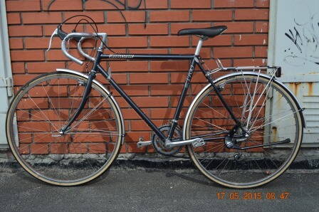 Шоссейный, винтажный, но в туристической комплектации, в отличие от сугубо спортивных сет-апов сторожил форума, а именно, крылья, багажник, даже подножку приставил.