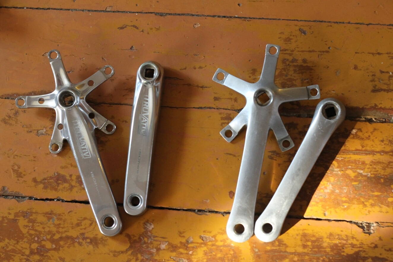 Вот такие шатуны у меня были в наличии. Слева те, что пришли с группой Shimano Sora. Справа, пострашнее, от Shimano Biopace - мне подарил продавец рамы вместе с укатанными звездами. Я еще отнекиваля от них, гордо заявлял, что мне скоро приедут шатуны с группой Sora, а эти мне ни к чему, но продавец настоял, сказал, что ему они нафих не нужны и что они точно подойдут к этой каретке.