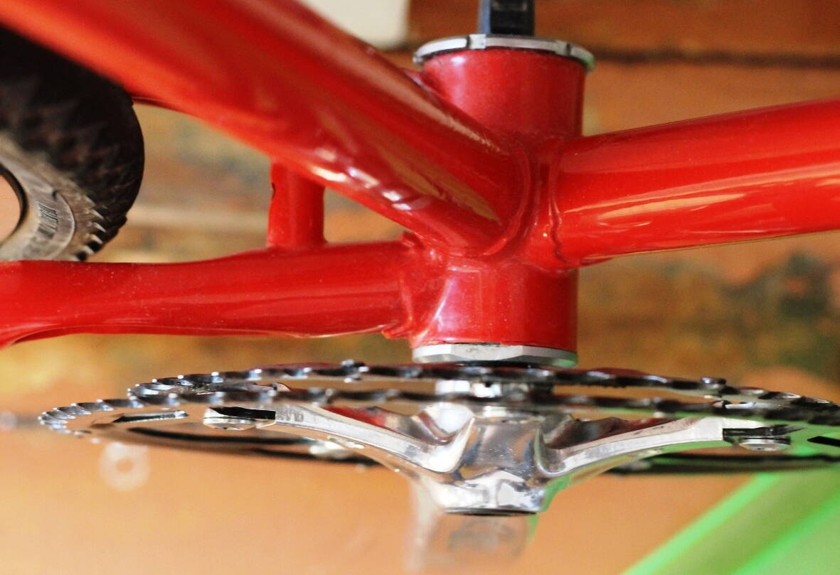 Из проблем - не рабочая маленькая звезда кассеты. Цепь трет о перо рамы. Решается, видимо подбором проставок (шайб) на левую и правую сторону оси колеса. Колесо шло с одним спейсером на 7мм, установленным с левой стороны. Колесо при этом немного сдвинуто в правую сторону. Надо убрать этот спейсер и подобрать шайбы на левую и правую сторону так, чтобы колесо встало по центру. Возможно тогда и маленькая звезда заработает.