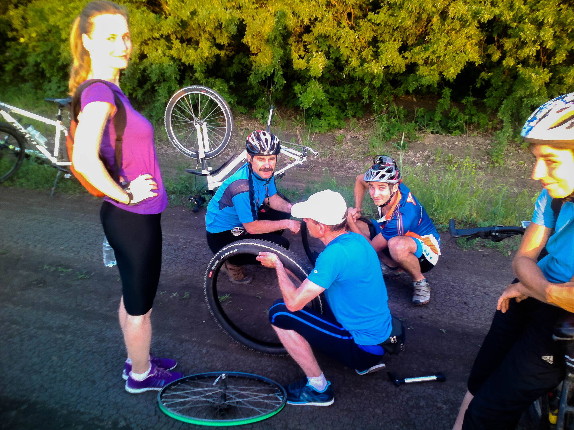 Спасибо опытным велосипедистам за помощь в устранении прокола участнику колонны! Супер!