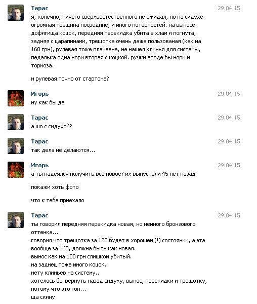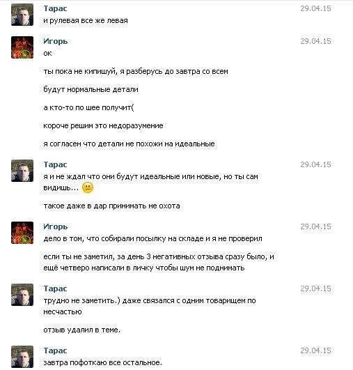 Очень суетился ровно до того момента, как я отправил ему на приват 1250 грн 17 апреля. 29 апреля получил все таки свою посылку... Это была коробка, а внутри все детали свалены в кучу в кулек, но хуже всего то, что оказалось внутри. А внутри у нас оказалось полнейшее барахло, фотки которого прикреплю ниже. Признание в том, что он отправил хуйню видно на скринах, так же как и то, что он обещал все исправить. Так же прилагаю скрины зачистки темы с отзывами, что случалось сразу при написании критики в их сторону. Сейчас эта тема закрыта вообще!