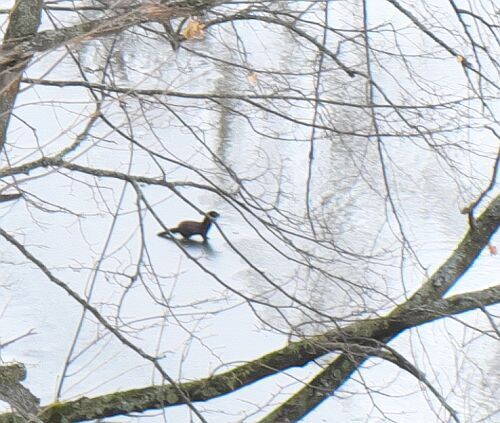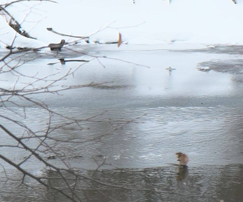 Именно по этой причине и не смог толком снять странную активность ондатр. Никогда раньше не доводилось видеть больше одного зверька в одном месте, а тут - сразу трое! Что-то их явно беспокоило: зверьки активно плавали по незамерзшей части реки, иногда вылезая отдохнуть на закраины, а порою - с шумом и плеском ныряя под воду. Возможно, что их беспокоило присутствие норки в том же месте? Не имея телевика, я присел на берегу на бревно, в надежде, что норка, следуя по ледяной закраине, неизбежно пройдёт прямо подо мной, но зверек фотографироваться не захотел, а потому переплыл Донец, и принялся там носиться под берегом, заставляя толстых крысок плюхаться в воду... Мне же оставалось только "облизываться", воображая, какие кадры я мог бы снять, возьми я свои 230 мм и штатив вместо бесполезных сегодня 18-55!..
