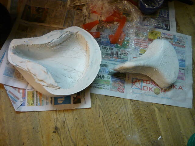 Затем прокладываем плёнку изнутри и заливаем гипс внутрь седла