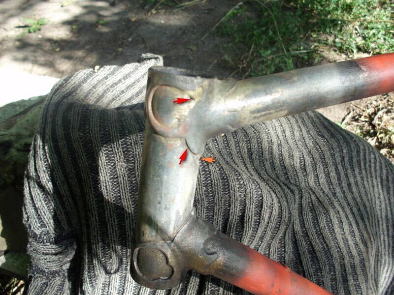 Рулевая колонка при рихтовке рамы после пайки (видимо) получила гофр (оранжевая стрелка) и две дырки, видимые на просвет! (красные стрелки). Частично это все залито припоем.