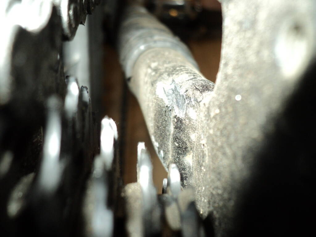 На самом деле проблема врожденная, но недавно нашел хорошую дорогу, где можно долго поработать на максимальных передачах. И за пару поездок не хило проточил перо рамы.