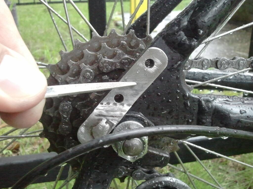 Нет худа без добра. Вчера был ацкий ливень, пробил колесо "всплывшим" саморезом. Решил к замене камеры приурочить апгрейд дропаута :D . Все встало как надо, теперь цепь на высшей передаче летит в 4-5мм от пера :D .