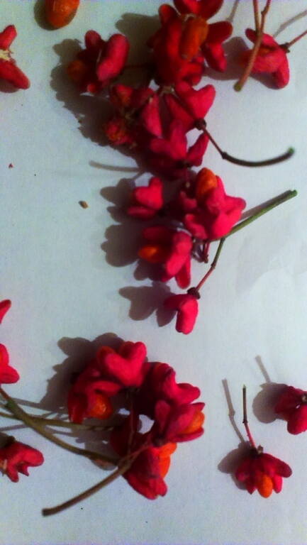 Бересклет. Хоть на фото очень плохо и видно, то треуголные "коробочки", из которых выпадают "на верёвочках" ярко-красные ягоды с черным "глазом" - это точно он.