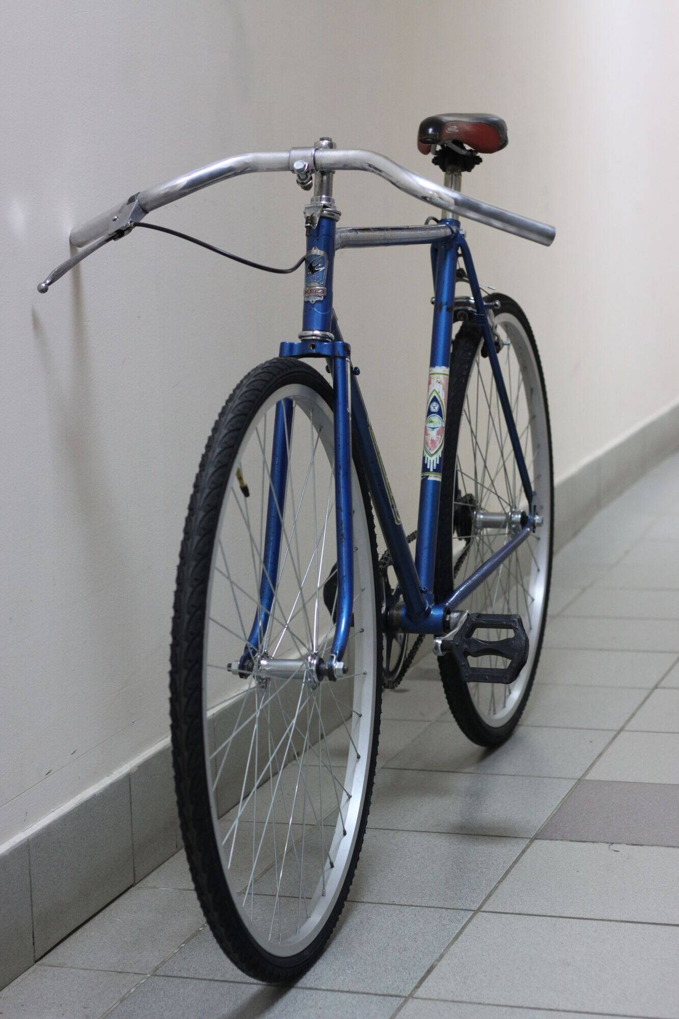 Доброго вечера всем. Решил выложить почти собранного "питомца". Рама "Турист" 1980 г. была спасена из рук малолетнего модернизатора))) Рама немного гнута, но выбросить руки не поднимаются. Решено сделать сингспид. Все что у меня было это рама с вилкой, рулевая и вынос. Рама местами была залита битумом))) Видать тот еще любить погонять по свежему асфальту))) Лакокрасочно как будто "бобры" грызли. Рулевая была перебрана, рама отчищена и покрыта лаком. Руль взял по дешевке на рынке, как оказалось от позднего Туриста с клеймом ХВЗ.