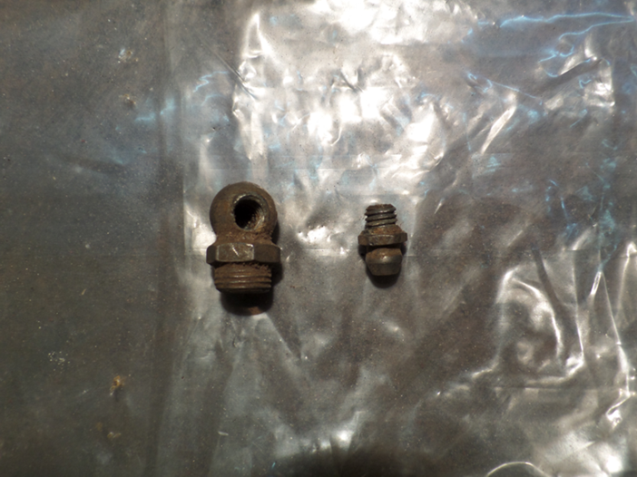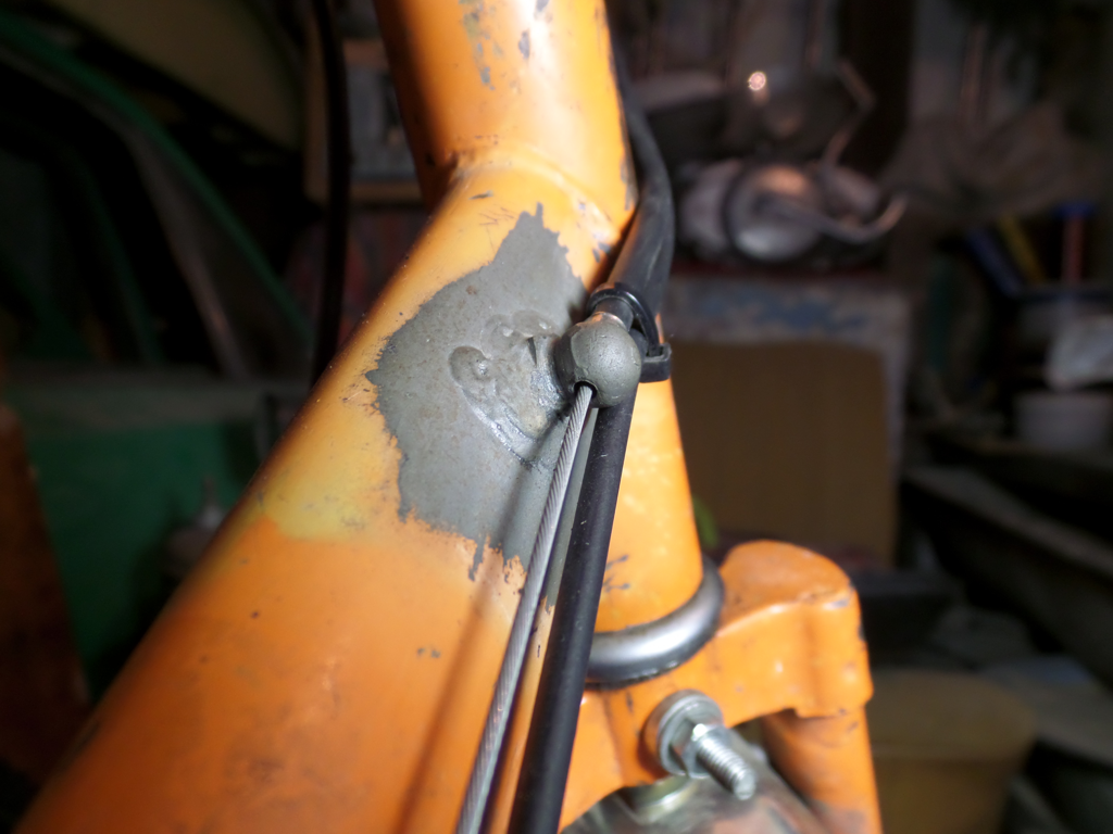 Так как я тогда ничего не знал о высоких велосипедных материях, то решено было делать "рваную рубашку", потому в качестве упоров под отдельные кусочки подошли обыкновенные автомобильные пресс-масленки. Со срезанной резьбой на "корпусе", малость рассверленном отверстии под саму масленку, и просверленном отверстии под трос. Получилось не очень эстетично, в основном из-за необработанных сварочных швов, но когда( а точнее - если :D ) надумаю красить раму, то ясное дело болгаркой там все подмарафечу.