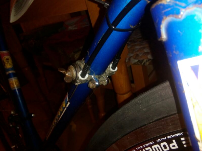 Чтобы поставить шоссейные манетки на вынос нужно приваривать боночки-упоры, либо покупать хомут с упорами. Либо заниматься самодеятельностью.. у меня вот временное решение вот такое. Два дюбеля в старое крепление манеток отлично служат упорами уже месяц. Пугает только то, что всякие временные решения на деле оказываются очень даже долговременными :lol: Хотя мне думается, что тросики можно пустить прямо в рубашках до переключателя или уже готового упора и будет работать.