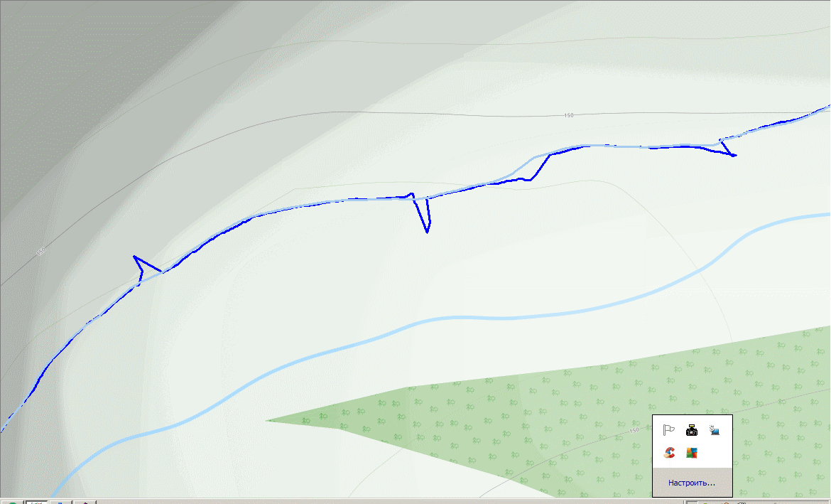 Теперь про срезание отдельных пиков. Привожу несколько скриншотов, используя вышеупомянутый трек. Взял кусочек, где мы шли по ровной грунтовой дороге без существенных изгибов, но на треке появилось несколько явных выбросов в сторону от основной траектории движения (напоминаю, мы шли по дороге и с неё не сходили).