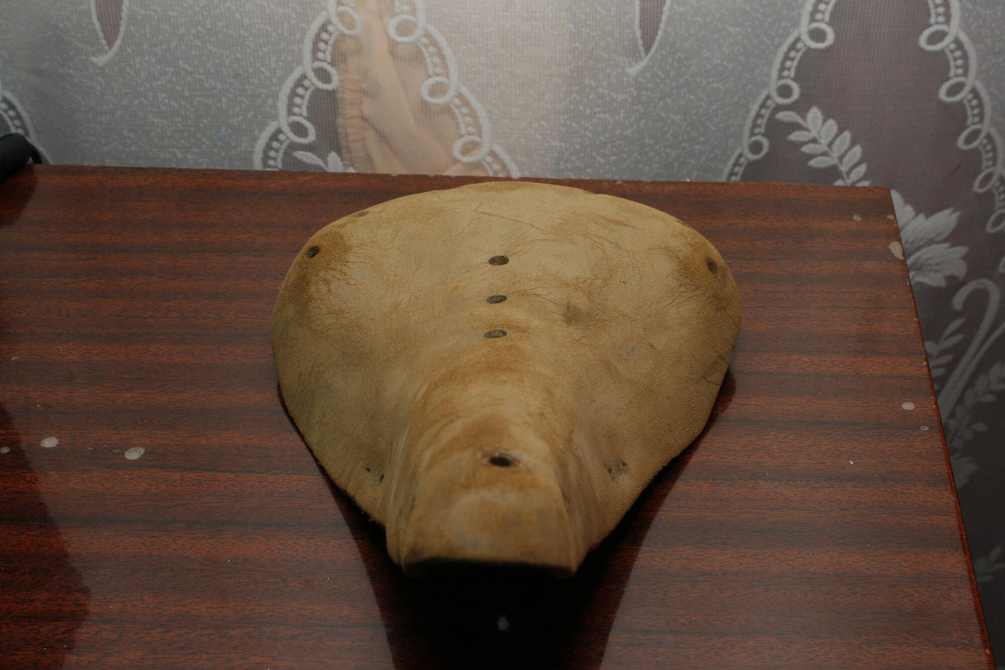 Що було зроблено: вирівняна рама, зашкурена шкіра, витримана в желатині, натягнута на каркас (вирівняна форма сідла, прибрані провісання) та висушена, зашкурена та вимочена ще раз (бо дуже пересохла в духовці). Не фарбував, вийшов такий природній колір. Рамка з усіма прибамбасами покрита нікелем. Заклепки - гвинтики для паска ;)