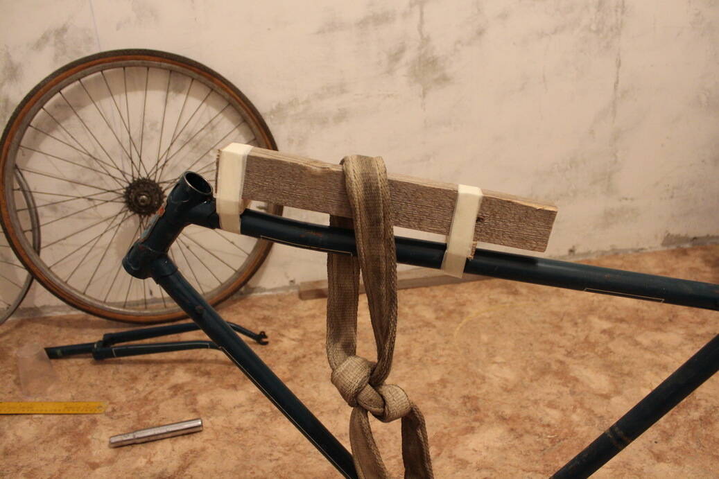 Вообщем начал пробовать правку рамы веревочным методом. Так как рук у меня всего две, пришлось приклеить брусок маляркой каб не сваливался, взял старый ремень и начал крутить (по соображению, что он широкий и более равномерно распределит передоверяемую нагрузку на раму) В результате первой попытки брусок помялся,ремень порвался, а результата ноль :unknown: