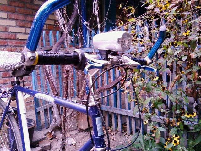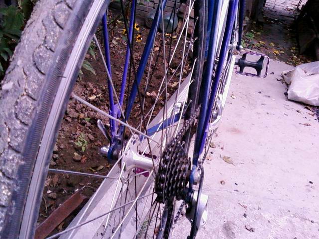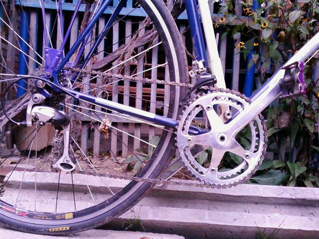 :-)На этом велосипеде теперь ездит мой отец(110кг)по этому здесь такое модное седло. Система шоссейная(самопал из лопасти самолёта-кованая и фрезерованая моим хорошим знакомым.Прототип Campagnolo Record 180mm, звёзды ХВЗ 52/44),трещётка шоссейная shimano (13/14/15/17/19/21/24),передний переключатель на три звезды shimano FD-TZ30,задний shimano alivio.Резина Kenda на передок 23 на зад 25. Ручки и грипсы без названия. Остальное без изменения :-)