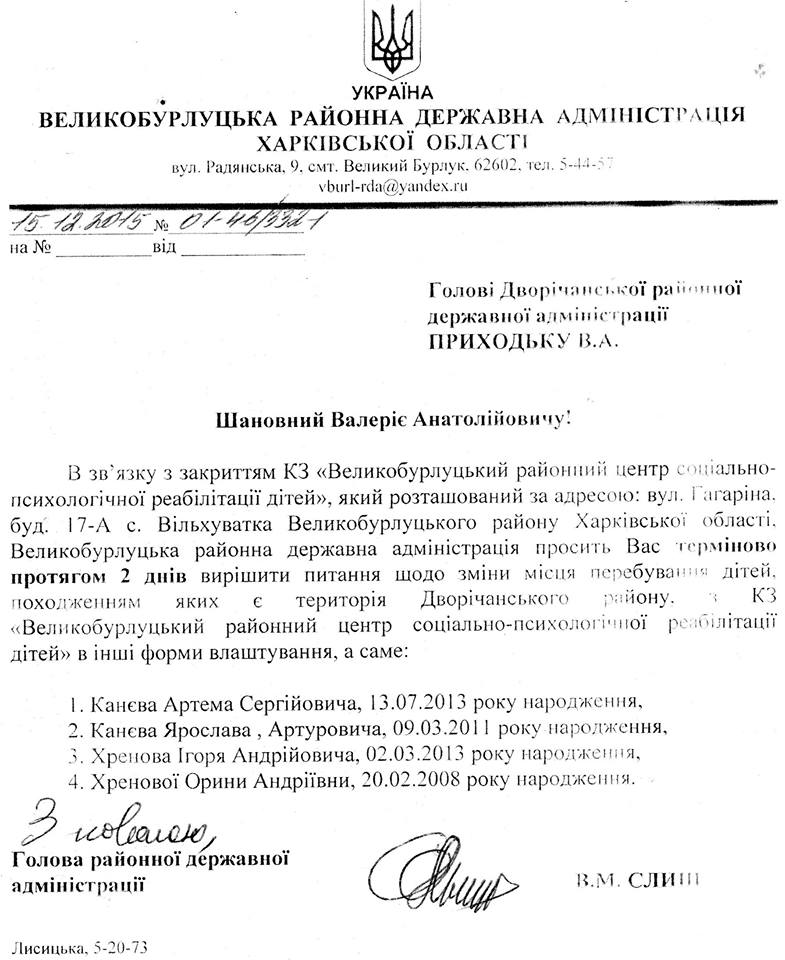 Тим часом голова райдержадміністрації Великобурлуцького району Слиш В.М. (https://www.facebook.com/viktor.slysh?fref=ts) почав розсилати по районам прохання забрати дітей із Центру, мотивуючи це «закриттям Центру» (копії документів додано).