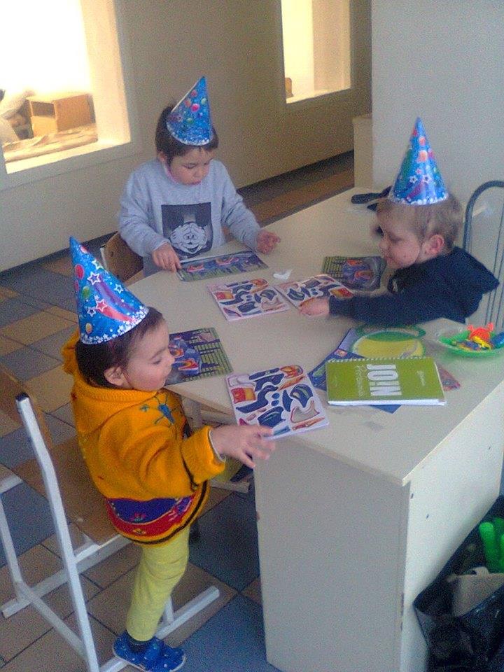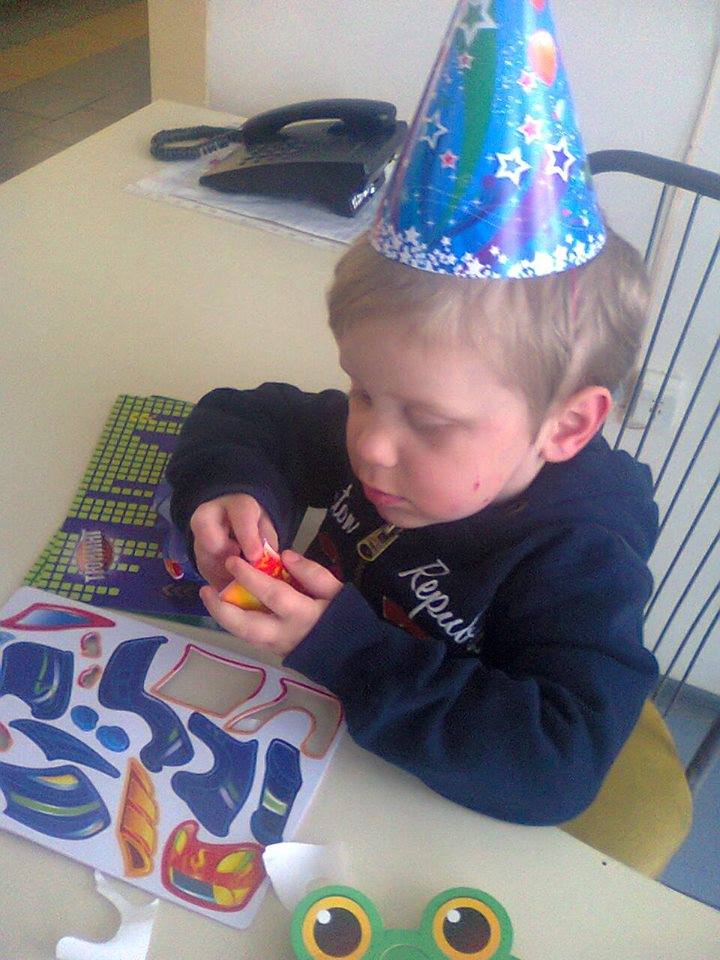 Все было здорово, детвора в колпачках, хоровод, много мыльных пузырей, и шаров, обнимашек и щекатушек. К сожалению совсем чуть - чуть конфет, но зато новый спортивный костюм и свитер. И уж конечно же наши малыши Додя(так называют Давида))) и Ромик. Мы отправились в путешествие на машинах, но перед путешествием сделали тюнинг нашим машинам. Оказалось не так просто клеить самоклеечные детали, но до конца не успели... Детям нужно спать, попробую завтра повторить. Ребята, не знаю кто купил огромные мячи, но это супер!!!! Коррекция ребят на этих мячах даст возможность развитию речи!!!, СПАСИБО!!!