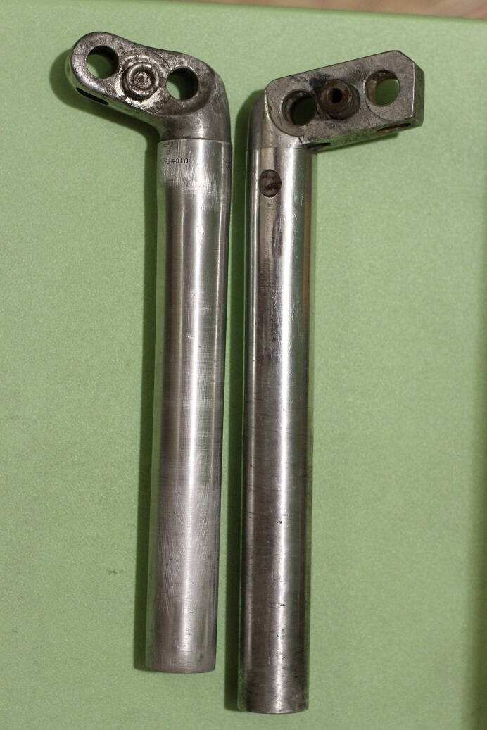 Что самое интересное, что при том, что сам штырь, полностью алюминиевый, салазки под крепление седла, стальные в хроме (уже в лимонке купаются). Хотя во всех каталогах, даже 50х-60х годов на кавмповских штырях, салазки алюминиевые. Сравнил со штырем ХВЗ, "братство" улавливается невооруженным глазом: