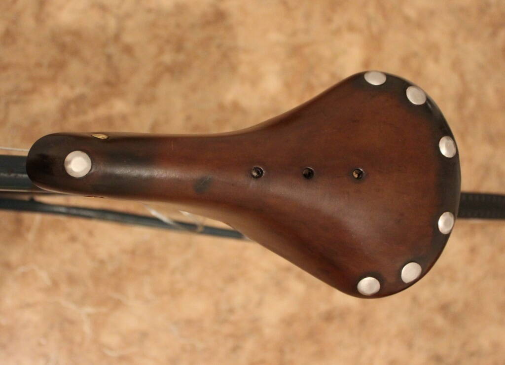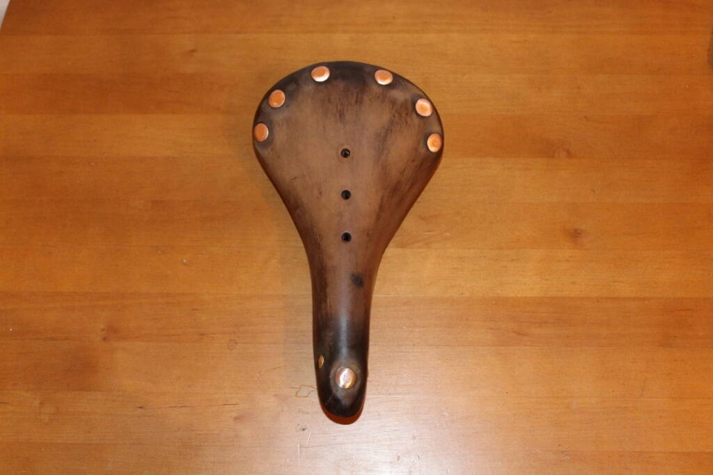 - приведено в прядок сидение. С сидением отдельная история.))) Купил на барахолке заклепки медные, а они оказались алюминиевые с медным покрытием и это я понял только тогда когда начал их полировать)) расклепывать и переделывать было уже поздно, да и я в белых штанах не катаюсь.)) Красил седло по методу описанном на 25 странице темы про седла ХВЗ. Вот только при за чистке проявились черные пятна и было решено сделать переходы с черного на коричневый, так как уж больно хотелось коричневое седло подстать ручкам руля.