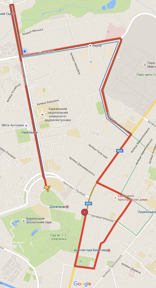 площадь Свободы - проспект Науки - ул. О. Яроша – проспект Науки – ул. Новгородская - ул. Динамовская - ул.Сумская- ул.Ярослава Мудрого-ул. Алчевских- ул. Чернышевская- ул.Скрыпника- ул. Сумская - площадь Свободы