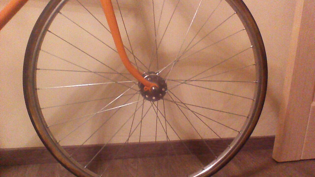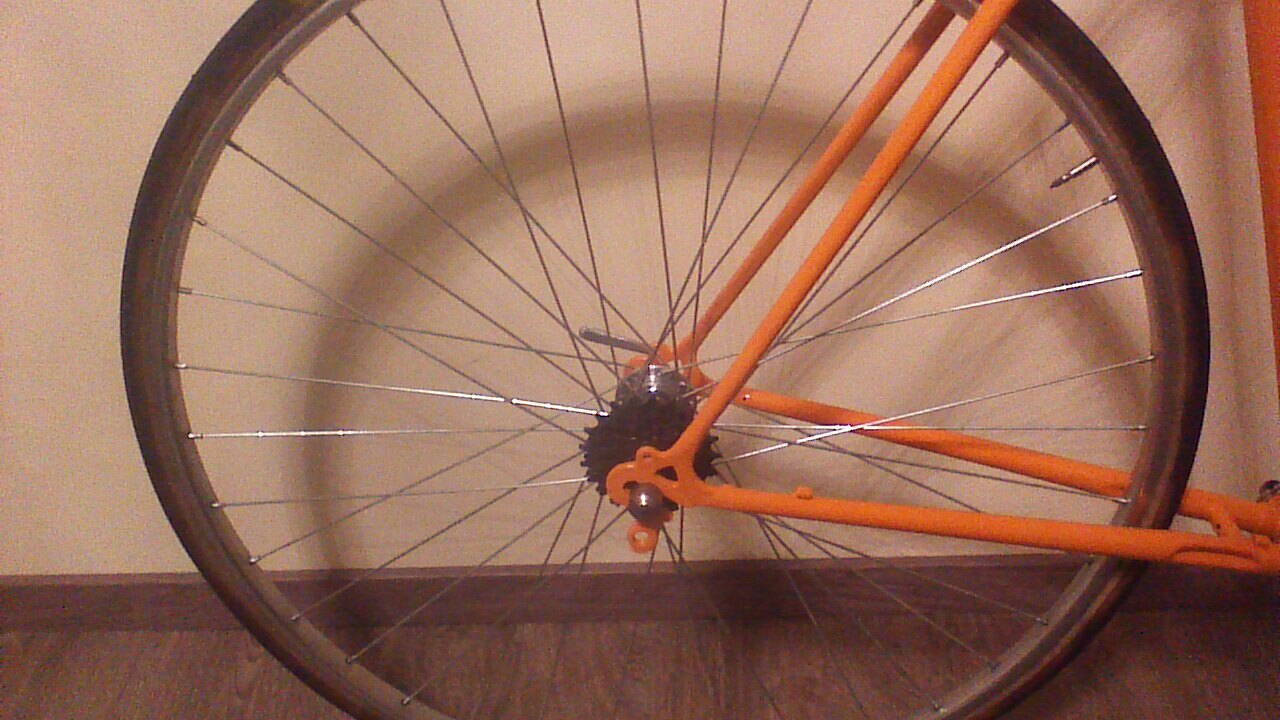 Пока ждал колеса, упражнялся с рамой. Изначально была мысля оставить родное ЛКП, но жизнь внечла свои коррективы. Правая чашка каретки закисла настолько, что выкрутить нежно не получилось. Все известные способы - болты М18, постукивание отверткой и пр к успеху не привели. Лечение было - прогревание кареточного стакана паяльной лампой. Ну раз уж ЛКП испорчено, то заодно снял напильником лишние выплески металла на узлах. Рама была отдана в покраску в Полифарб (это не реклама :D ). Цвет - RAL 2000, на палитре он соответствовал оригиналу, но в результате получился немного рыжее. Рабочее название изделия "Морковка" появилось само собой :D.