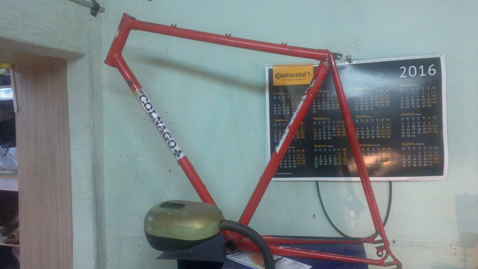 Рама естественно не Кольнаго. Видимо хозяин был, любителем этой итальянской марки. Проблем с рамой очень много. Рама боевая, вмятина на вмятине. Плюс дыра в подседельной трубе.