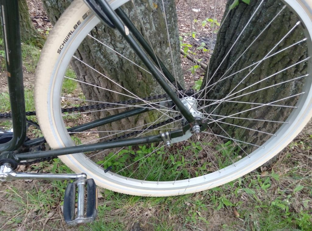 Но белые шины на таких ободах - колёса визуально теряются. На этом велике с фотки всё смотрится органично, ибо цвет рамы рамы нежный, и весь вел такой "акварельный". Глаз в этой равномерно-акварельной картинке автоматически выделяет детали, и всё хорошо смотрится.