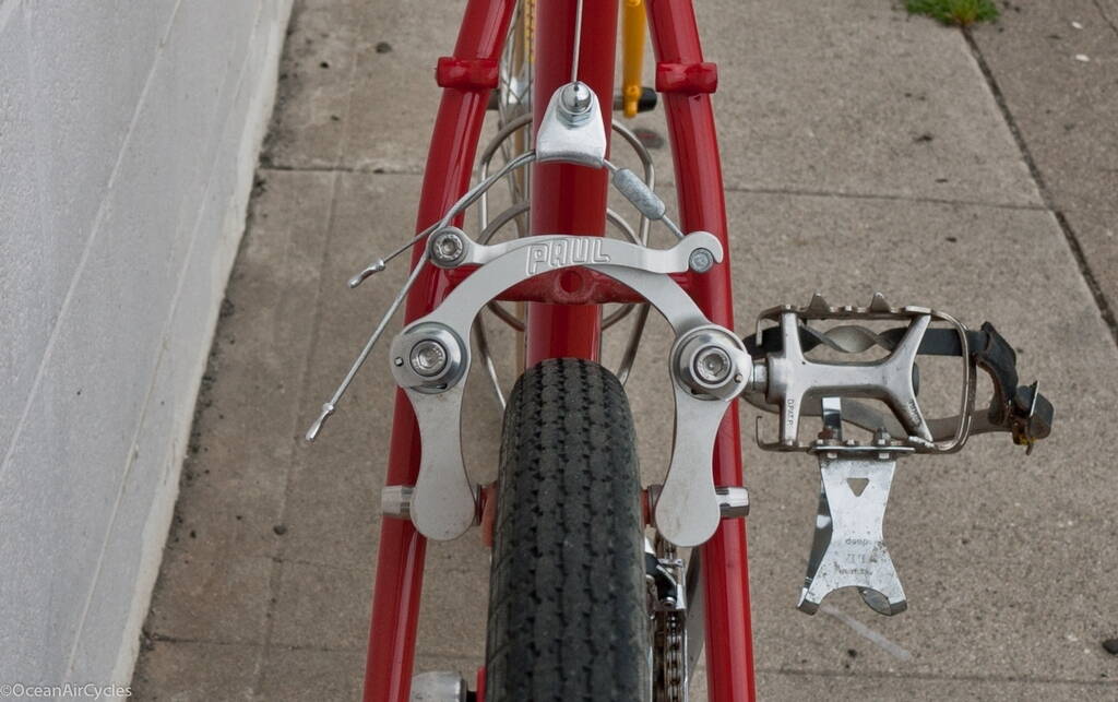 Поэтому примерно с 1960-х гг. распространились клещи с центральной тягой. Непонятно, почему, кстати. Привод их имеет много сочленений, он излишне упругий (за счёт «лишнего» поперечного тросика и «клювов» - упоров боудена на рулевой колонке и подседельном болте). Вроде от осей рычагов до колодок плечо рычага маленькое, но сами эти оси при работе тормоза упруго расходятся… Вобщем, неясно, за какие заслуги этот тип тормоза доминировал на гоночных велосипедах лет 20. За немного более надёжную регулировку?